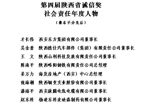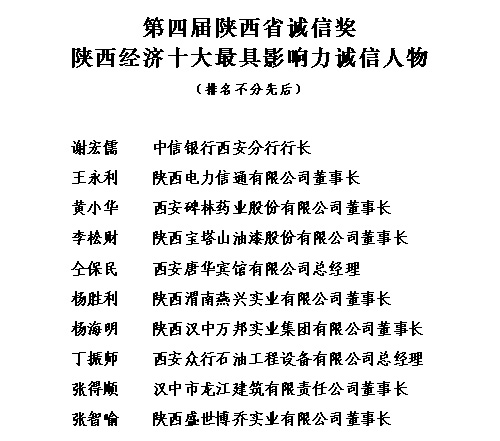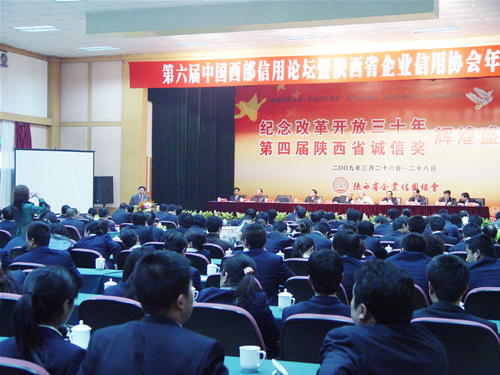 2009年3月27日,紀念改革開放三十周年暨第四屆陜西誠信獎輝煌盛典在陜西丈八溝賓館隆重舉行,原陜西省委書記安啟元、省人大常委會前副主任劉遵義、省政協副主席張生朝、省政府副秘書長王紅章、陜西省委辦公廳原副主任劉林亭、陜西省企業信用協會負責同志以及共建單位的有關負責同志、協會會員代表、獲獎企業、國家有關部委及各省、市有關部門負責同志出席了會議,全國各地信用組織、企業代表、有關專家學者共近千人參加了此次盛典。