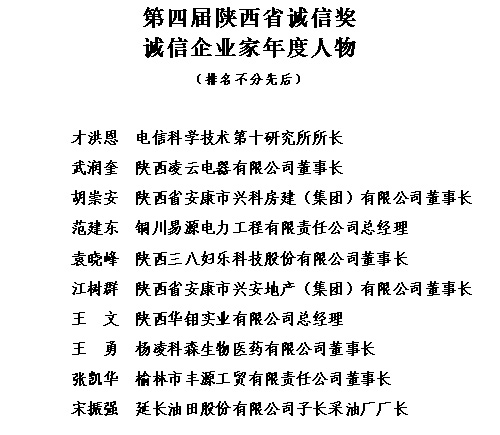 第四屆陜西誠信獎以“誠信創新,和諧陜西”為主旨,以“責任、自信、愛國”為主題,由陜西省企業信用協會聯合多家相關單位的專家學者,秉承公平、公正、權威的原則,按照誠信、創新、影響力、推動力的標準進行評選,中國人壽保險股份有限公司陜西省分公司總經理王新生等十位企業家獲得“陜西十大社會責任功勛企業家”榮譽稱號,中信銀行西安分行行長謝宏儒等十位企業家獲得“陜西經濟十大最具影響力誠信人物”獎,慶安集團有限公司董事長丁凱等十位企業家榮獲“創新陜西十大杰出人物”榮譽稱號。
