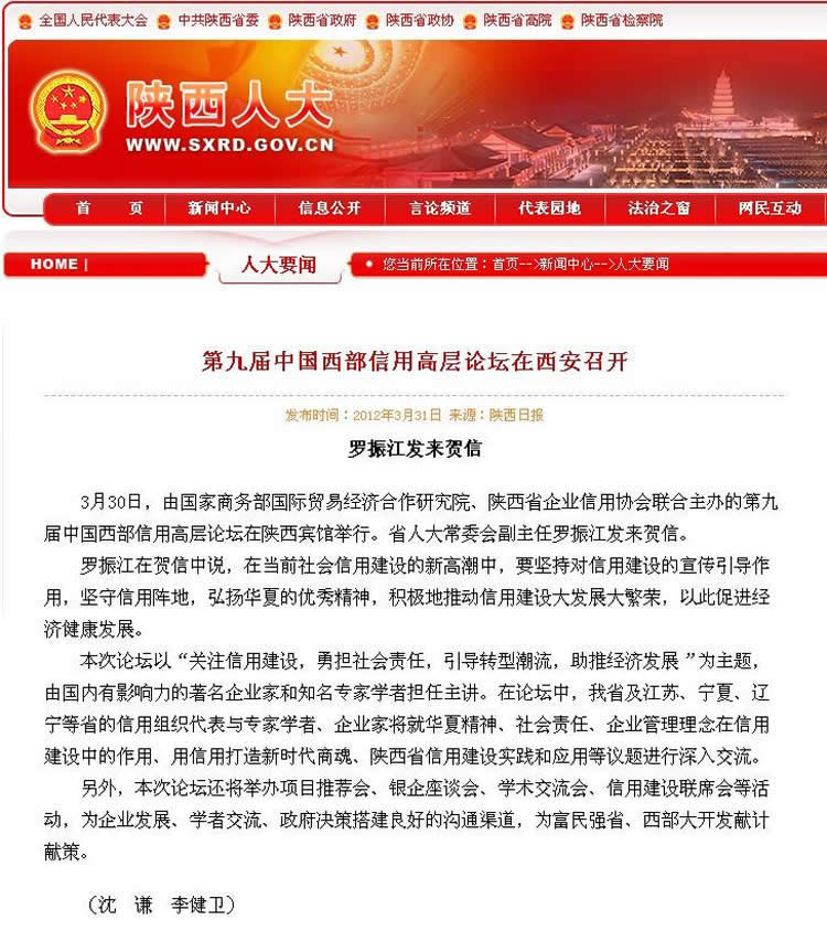 陜西省人大網《人大要聞》對第七屆陜西省誠信獎、第九屆中國西部信用高層論壇分別進行報道