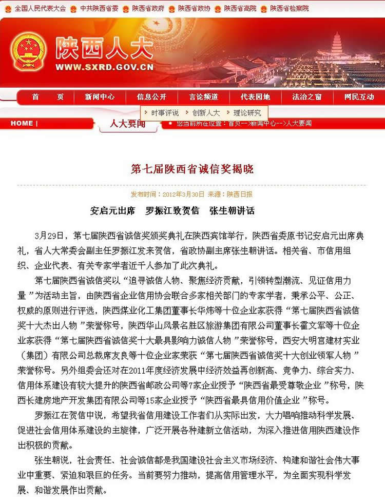 陜西日報在2012年3月30日《企業周刊》上對第七屆陜西省誠信獎進行專版宣傳