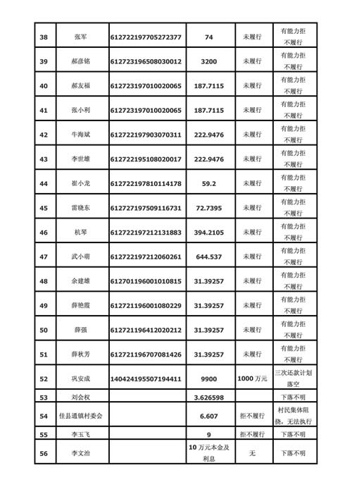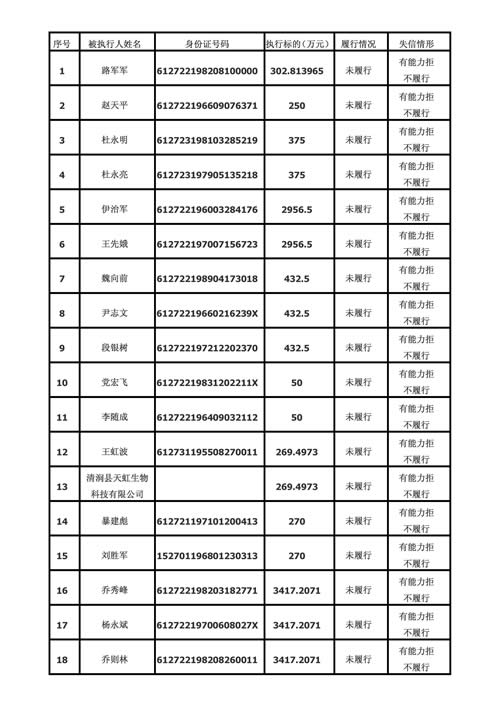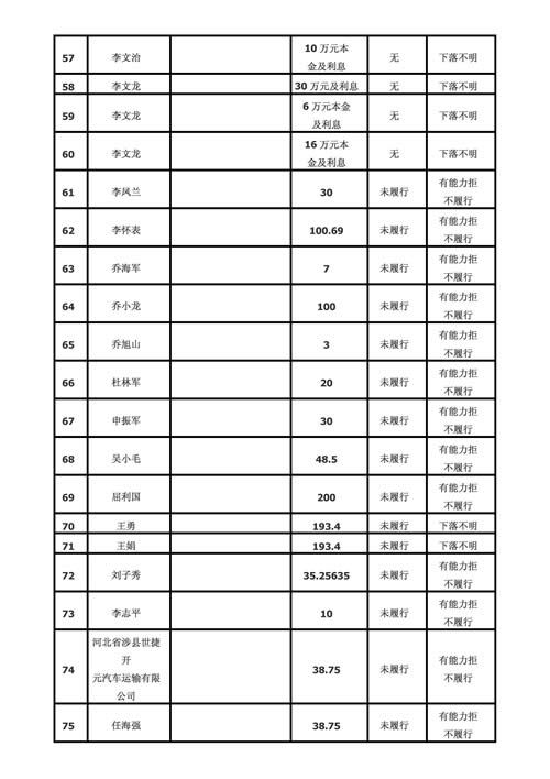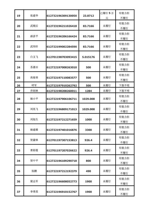 昨日下午,記者在榆林市中級人民法院官方微博“榆林中院”上看到,名單中公布了失信被執(zhí)行人姓名及其身份證號碼,并標明了失信被執(zhí)行人所涉及的案件號及執(zhí)行法院。在失信情形一欄中,除了6名失信被執(zhí)行人信息顯示為“下落不明”外,其余的失信被執(zhí)行人信息均顯示為“有能力拒不履行”。名單中75名失信被執(zhí)人未執(zhí)行標的金額在1.6萬元~3147萬元不等。