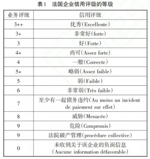 業(yè)務評級共分14級,按照字母順序從A至N排列,外加X級(企業(yè)數(shù)據(jù)未被央行掌握)。法國企業(yè)信用評級分為13級,根據(jù)其債務償還能力從高到低分別為3++~9(見表1)。P級表示企業(yè)被置于法院破產(chǎn)管理之下,當企業(yè)整頓方案通過后,企業(yè)評級將轉(zhuǎn)為6級;0級則表示銀行未收到關于企業(yè)的負面信息,包括未掌握近期財務信息或企業(yè)特殊性質(zhì),如投資公司等。