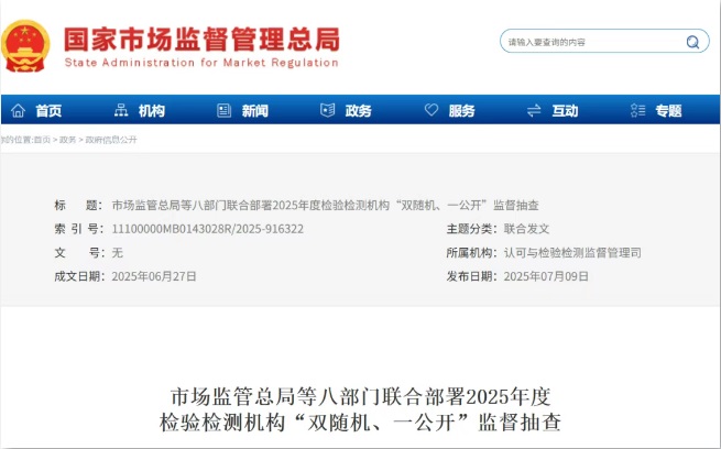近日,市場監(jiān)管總局聯(lián)合公安部、自然資源部、生態(tài)環(huán)境部、交通運輸部、水利部、海關總署、國家藥監(jiān)局印發(fā)《市場監(jiān)管總局等八部門關于組織開展2025年度檢驗檢測機構監(jiān)督抽查工作的通知》,決定在全國范圍開展檢驗檢測機構“雙隨機、一公開”監(jiān)督抽查,強化檢驗檢測活動監(jiān)管,規(guī)范檢驗檢測市場秩序,提升行業(yè)公信力,為經濟社會高質量發(fā)展提供有力支撐。