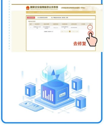 注意:部分市場監管部門提示 補報年報可免予行政處罰 可詢問當地市場監管局,是否:對未按時公示2024年年度報告的經營主體給予一定的寬限期,主動補報并公示2024年年度報告,且符合《中華人民共和國行政處罰法》第三十三條等有關規定的,可以不予行政處罰。 特別提醒:補報年報及信用修復均不收費,各經營主體要提高警惕,謹防上當受騙! 市場監管總局已經正式上線運行 市場監管信用修復全國統一平臺 經營主體打開國家企業信用信息公示系統(www.gsxt.gov.cn),點擊首頁的“信用修復”欄目即可跳轉到統一平臺登錄頁面。