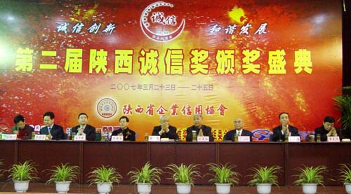2007年3月23日至25日, 第二屆陜西誠(chéng)信獎(jiǎng)年度人物齊聚西安,第四屆中國(guó)西部信用高層論壇暨第二屆陜西誠(chéng)信獎(jiǎng)?lì)C獎(jiǎng)盛典、省企業(yè)信用協(xié)會(huì)一屆四次年會(huì)在西安丈八溝賓館同期舉行。全國(guó)政協(xié)常委安啟元、省人大副主任劉遵義、省政府副省長(zhǎng)吳登昌以及國(guó)家部委及各省、市有關(guān)部門(mén)負(fù)責(zé)同志出席了會(huì)議,全國(guó)各地信用組織、企業(yè)代表、有關(guān)專(zhuān)家學(xué)者700余人參加了會(huì)議。