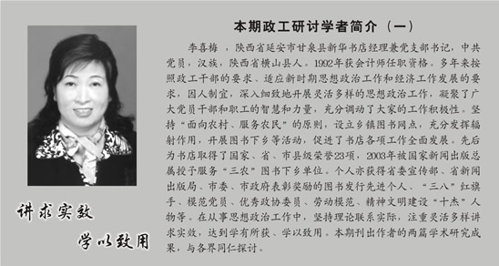 政工研討 本期政工研討學者簡介(一) 新時期如何弘揚延安精神………………………………………………………… 李喜梅 實施“五到戶”工程 推進農村精神文明建設……………………………………李喜梅 本期政工研討學者簡介(二) 淺談市場經濟條件下如何加強企業思想政治工作……………………………… 胡志東 學習“八榮八恥”榮辱觀 知榮明恥構建和諧書店………………………………胡志東 |